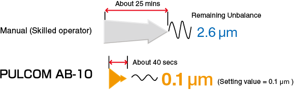PULCOM AB-10 adopts high performance DSP (Digital Signal Processor), and the algorism is optimized by using Accretech’s (Tokyo Seimitsu’s) 3D coordinate measuring machine technology and roundness measuring machine technology. By moving weight, vibration change occurs and balance correction position can be calculated from this slight vibration change. Therefore, perfect balancing can be achieved in a short time.